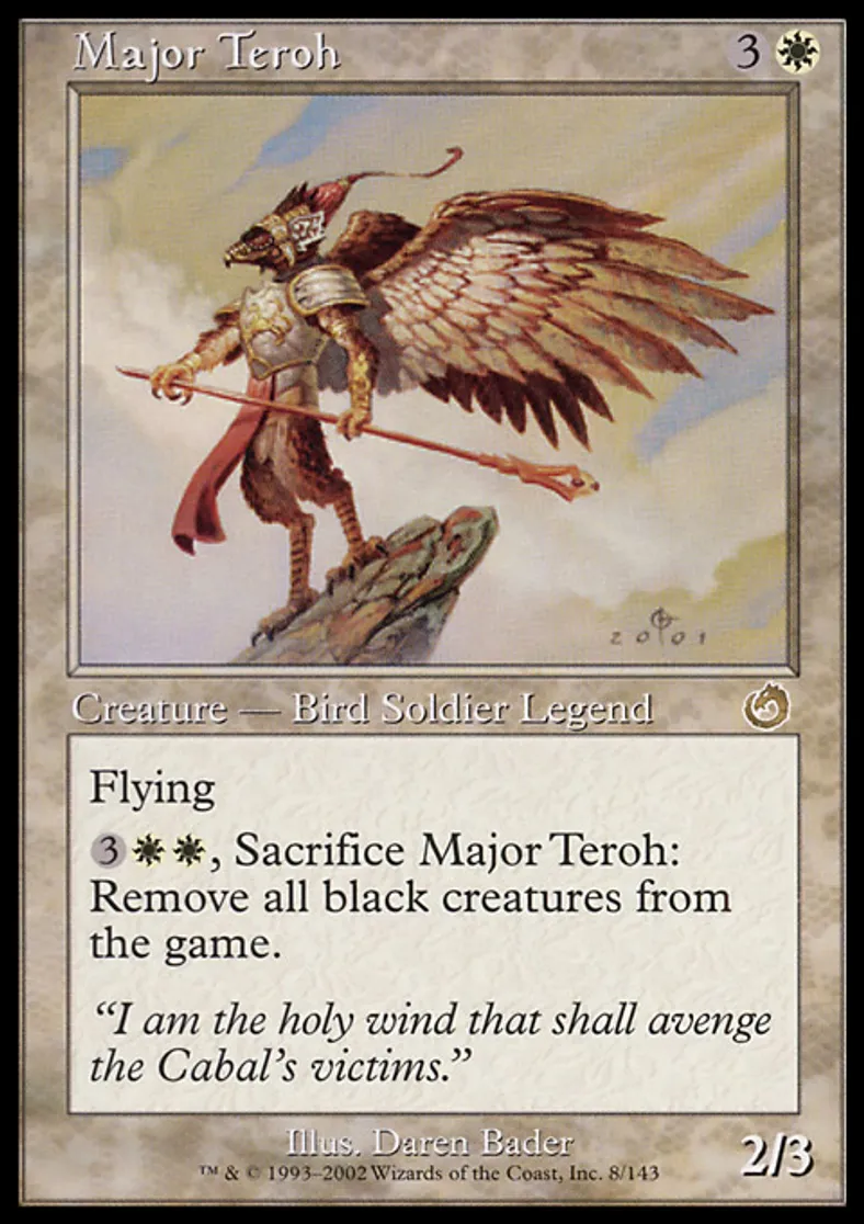 | Oracle Text | Flying {{3}}{{w}}{{w}}, Sacrifice Major Teroh: Exile all black creatures. | ||