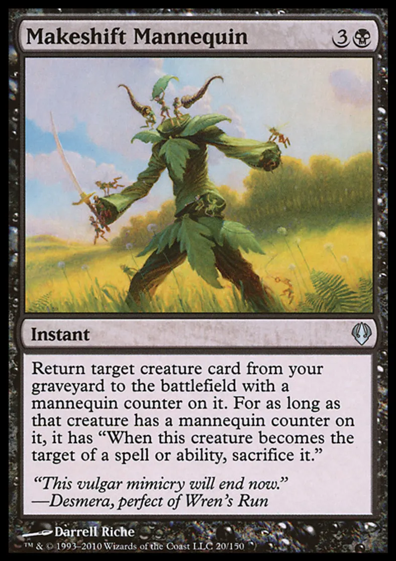 | Oracle Text | Return target creature card from your graveyard to the battlefield with a mannequin counter on it. For as long as that creature has a mannequin counter on it, it has "When this creature becomes the target of a spell or ability, sacrifice it." | ||