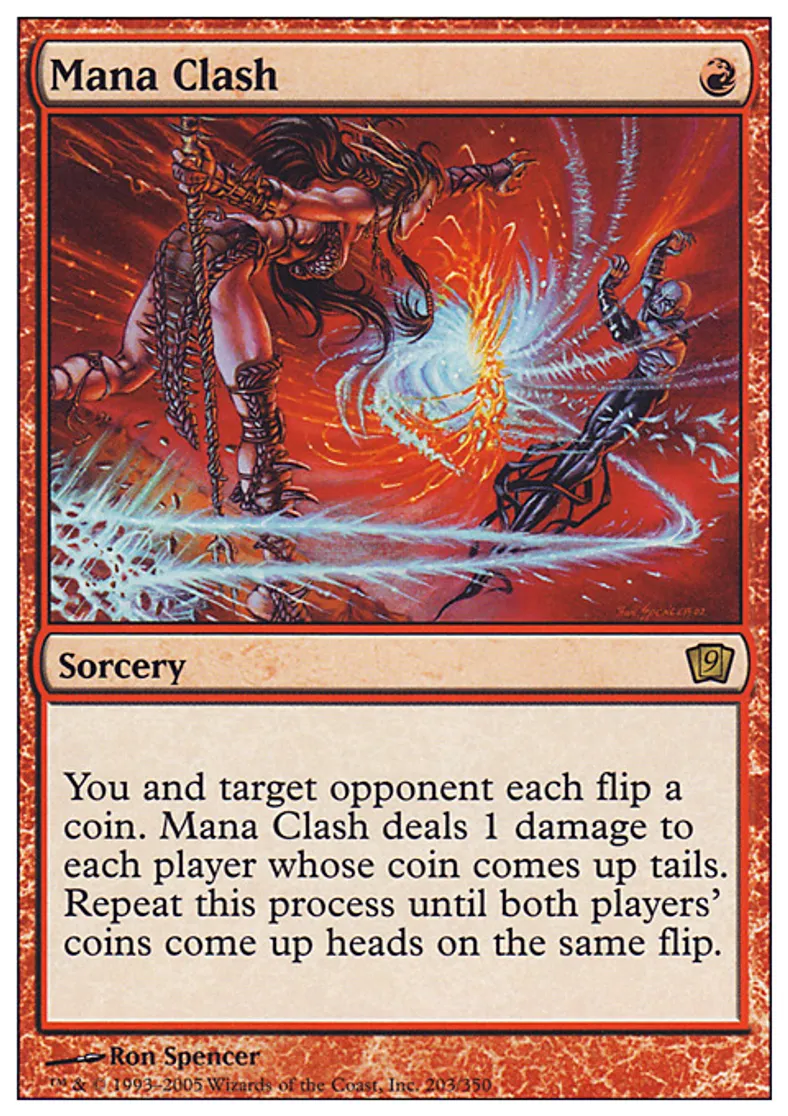 | Oracle Text | You and target opponent each flip a coin. Mana Clash deals 1 damage to each player whose coin comes up tails. Repeat this process until both players' coins come up heads on the same flip. | ||