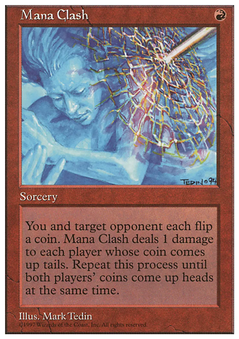 | Oracle Text | You and target opponent each flip a coin. Mana Clash deals 1 damage to each player whose coin comes up tails. Repeat this process until both players' coins come up heads on the same flip. | ||