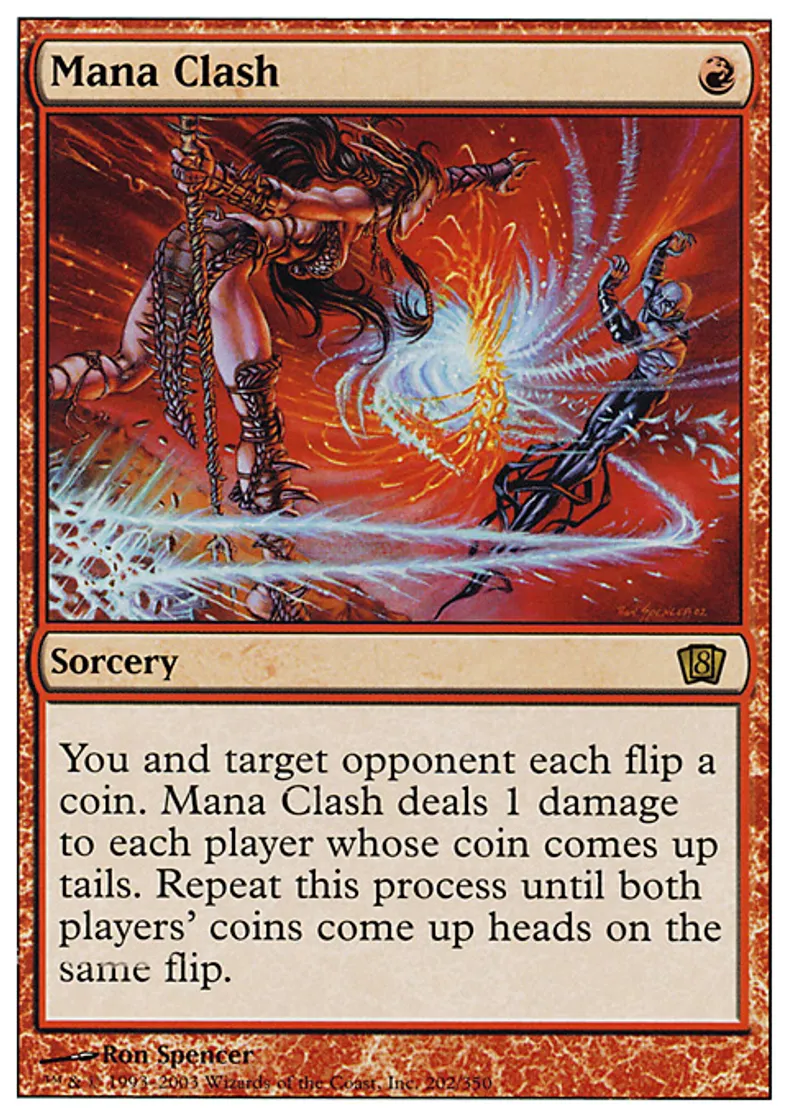 | Oracle Text | You and target opponent each flip a coin. Mana Clash deals 1 damage to each player whose coin comes up tails. Repeat this process until both players' coins come up heads on the same flip. | ||