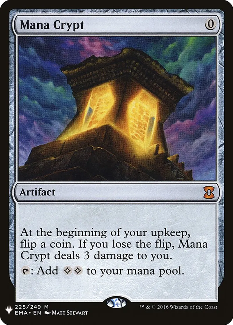 | Oracle Text | At the beginning of your upkeep, flip a coin. If you lose the flip, Mana Crypt deals 3 damage to you.