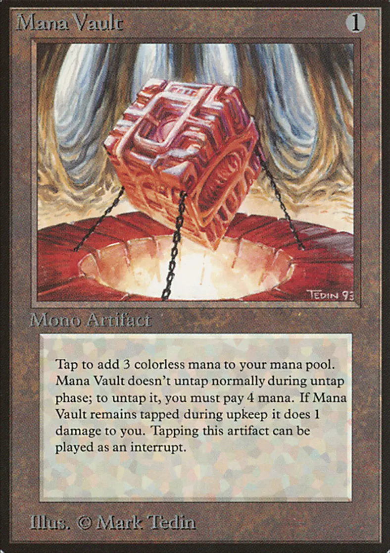 | Oracle Text | Mana Vault doesn't untap during your untap step. At the beginning of your upkeep, you may pay {{4}}. If you do, untap Mana Vault. At the beginning of your draw step, if Mana Vault is tapped, it deals 1 damage to you. {{t}}: Add {{3}} to your mana pool. | ||