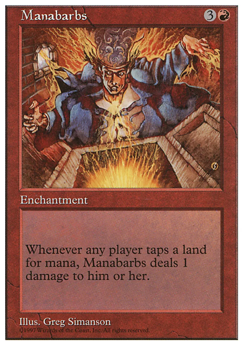 | Oracle Text | Whenever a player taps a land for mana, Manabarbs deals 1 damage to that player. | ||