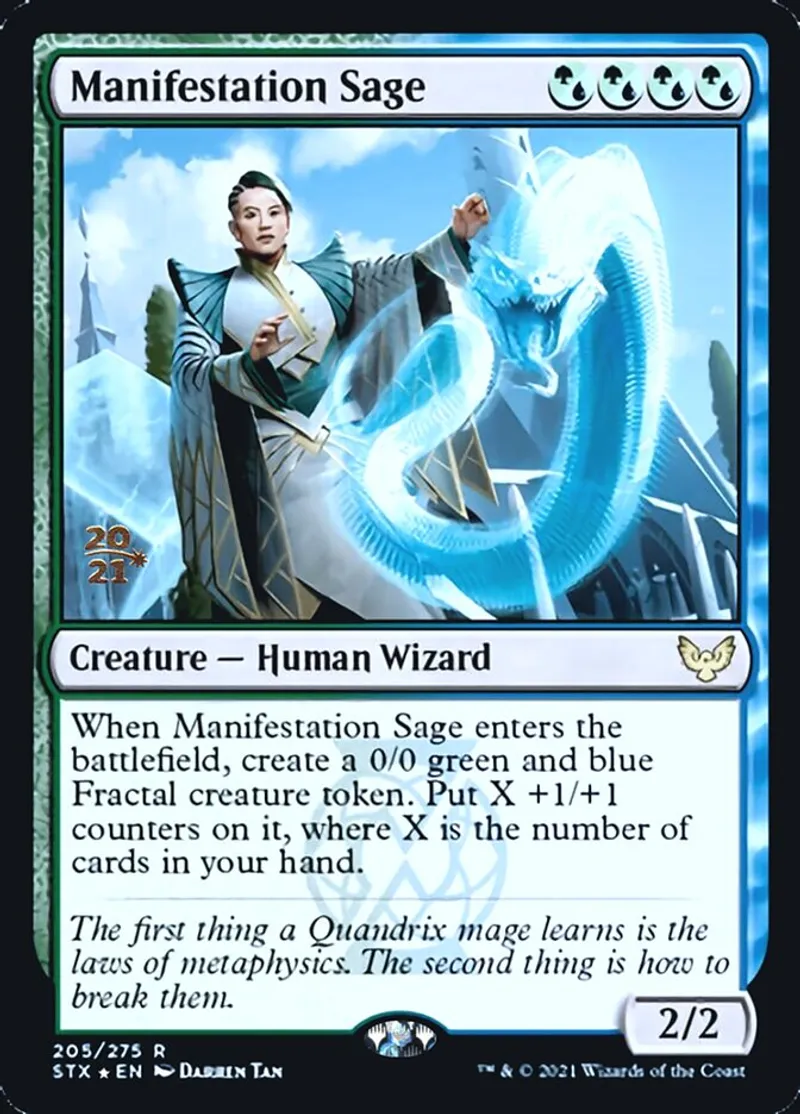 | Oracle Text | When Manifestation Sage enters the battlefield, create a 0/0 green and blue Fractal creature token. Put X +1/+1 counters on it, where X is the number of cards in your hand. | ||
