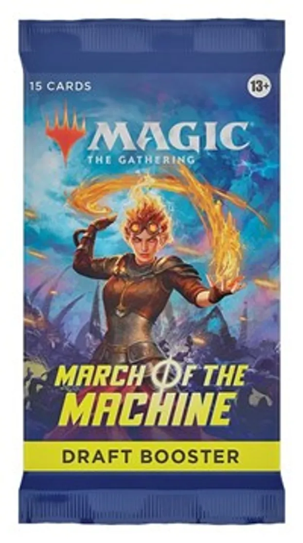 | Flavor Text | Each March of the Machine Draft Booster contains 15 cards and 1 token/ad card or Helper card, including 1–2 card(s) of rarity Rare or higher and 3–5 Uncommon, 8–9 Common, and 1 Land cards. Traditional Foil Borderless Mythic Planeswalker in <1% of boosters. Traditional Foil of any rarity replaces a Common in 33% of boosters. <br> Contents: <br> • 15 Magic: The Gathering cards per booster <br> • Best booster for drafting March of the Machine <br> • 1–2 cards of rarity Rare or higher in every pack <br> • 1 Traditional Foil card in 33% of packs <br> • Battle the Machine Legion as Phyrexians invade planes across the Multiverse | ||
