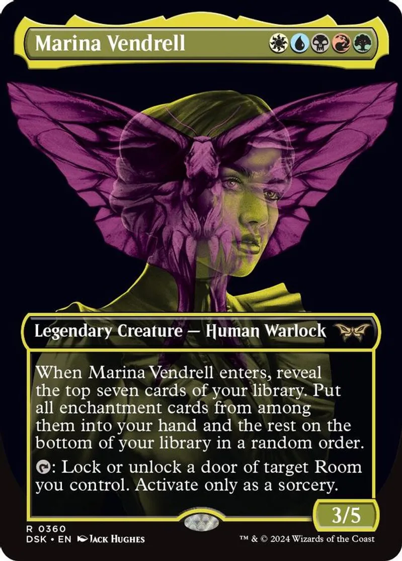 | Oracle Text | when marina vendrell enters, reveal the top seven cards of your library. put all enchantment cards from among them into your hand and the rest on the bottom of your library in a random order.