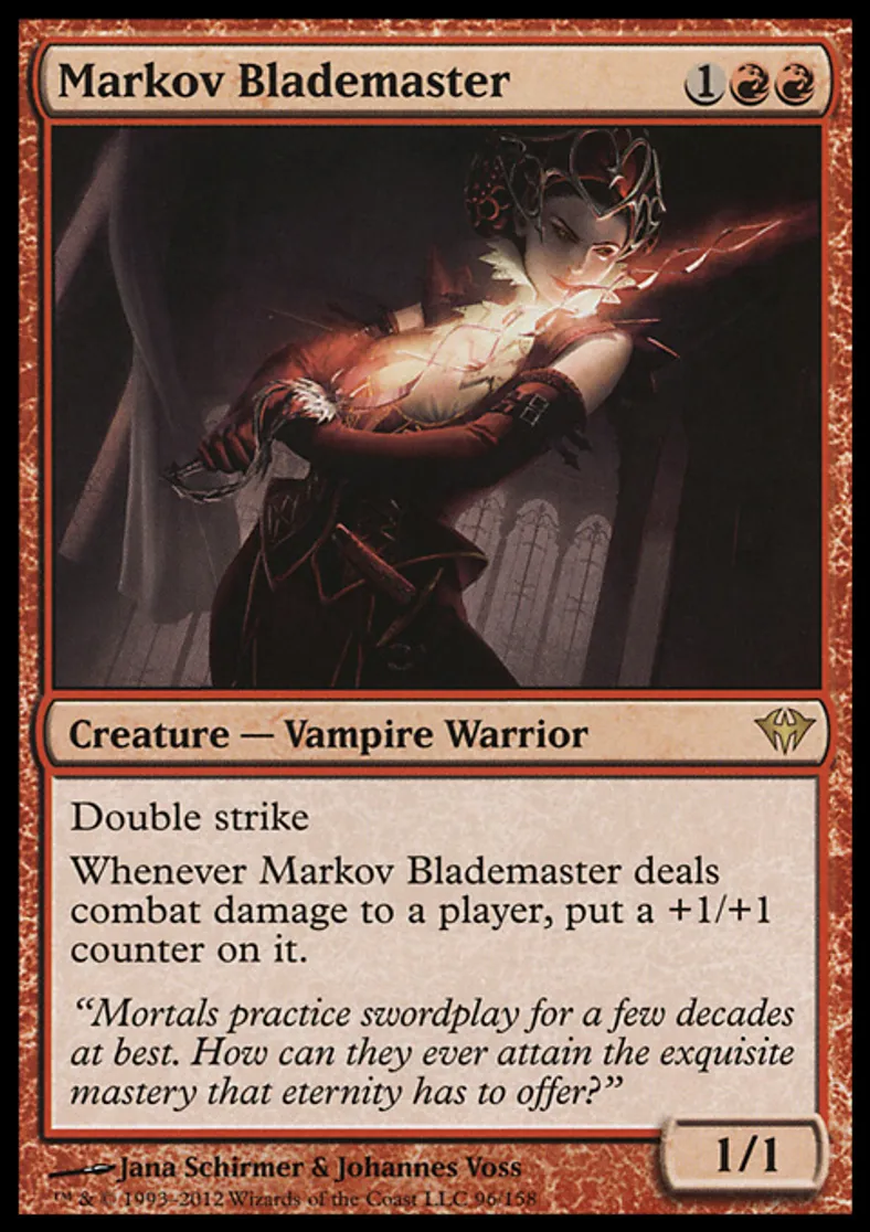 | Oracle Text | Double strike Whenever Markov Blademaster deals combat damage to a player, put a +1/+1 counter on it. | ||
