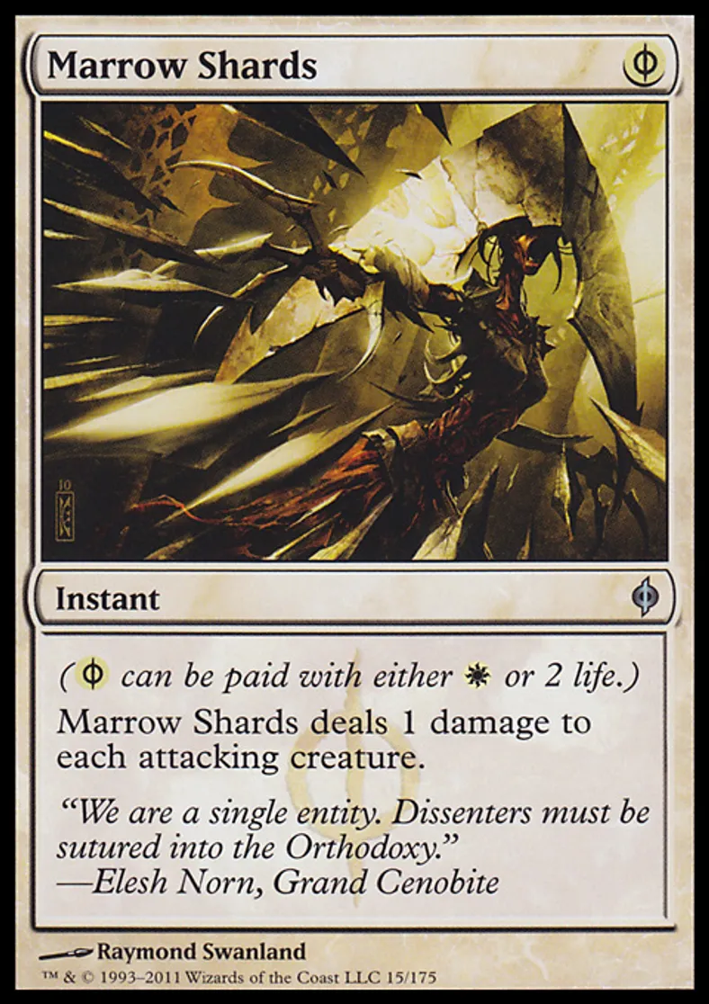 | Oracle Text | ({{Phyrexian White}} can be paid with either {{w}} or 2 life.) Marrow Shards deals 1 damage to each attacking creature. | ||