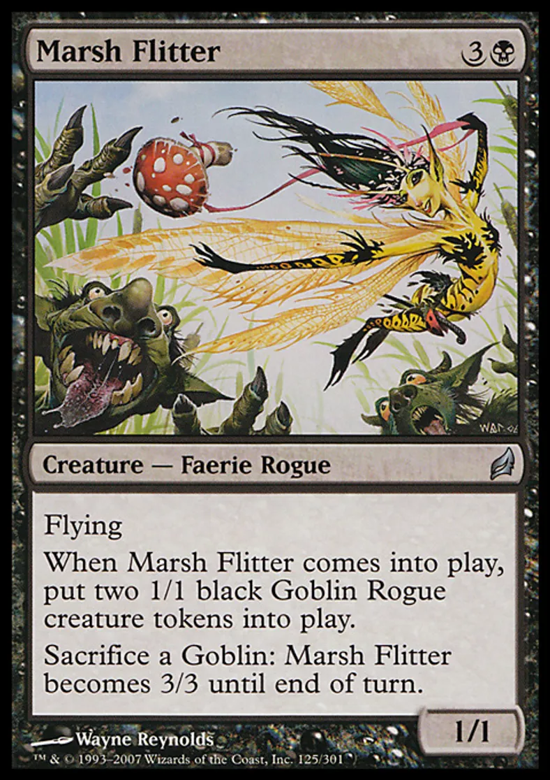 | Oracle Text | Flying When Marsh Flitter enters the battlefield, put two 1/1 black Goblin Rogue creature tokens onto the battlefield. Sacrifice a Goblin: Marsh Flitter becomes 3/3 until end of turn. | ||