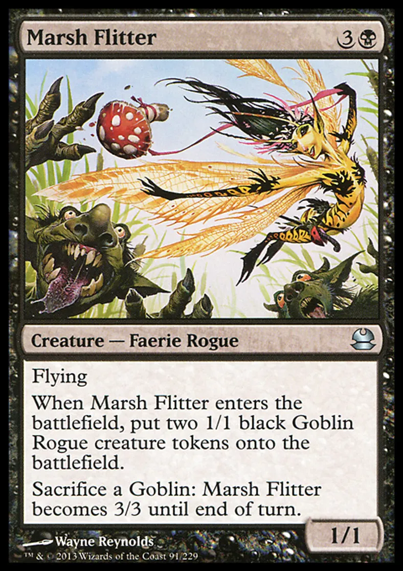 | Oracle Text | Flying When Marsh Flitter enters the battlefield, put two 1/1 black Goblin Rogue creature tokens onto the battlefield. Sacrifice a Goblin: Marsh Flitter becomes 3/3 until end of turn. | ||