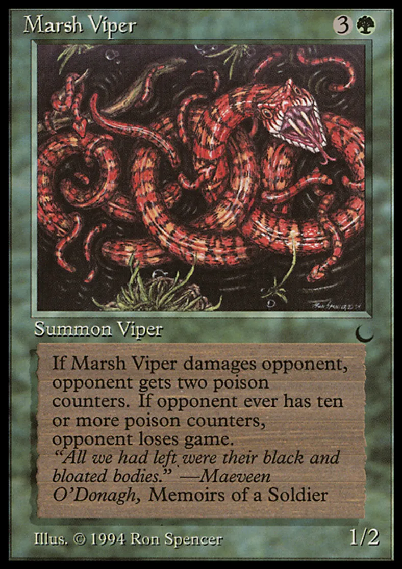 | Oracle Text | Whenever Marsh Viper deals damage to a player, that player gets two poison counters. (A player with ten or more poison counters loses the game.) | ||