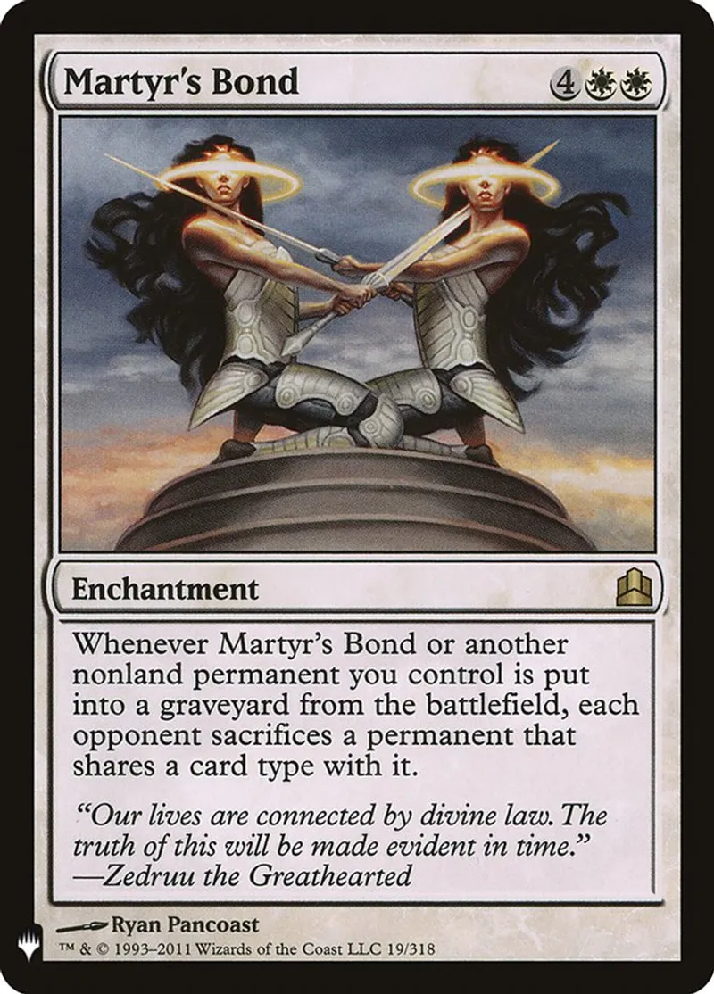 | Oracle Text | Whenever Martyr's Bond or another nonland permanent you control is put into a graveyard from the battlefield, each opponent sacrifices a permanent that shares a card type with it. | ||