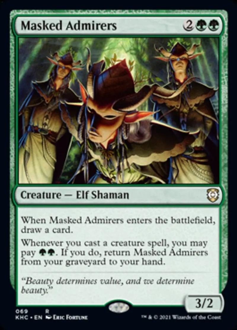Whenever you cast a creature spell, you may pay {G}{G}. If you do, return Masked Admirers from your graveyard to your hand. | ||