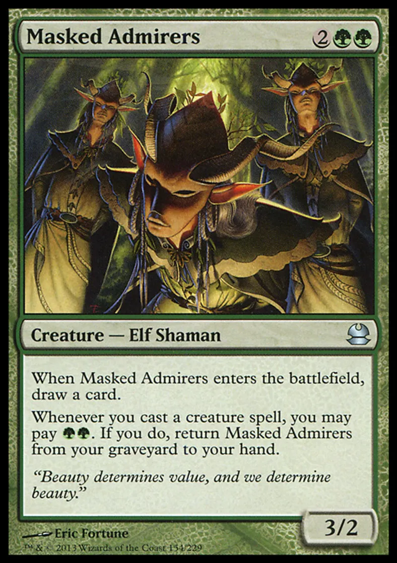 | Oracle Text | When Masked Admirers enters the battlefield, draw a card. Whenever you cast a creature spell, you may pay {{g}}{{g}}. If you do, return Masked Admirers from your graveyard to your hand. | ||