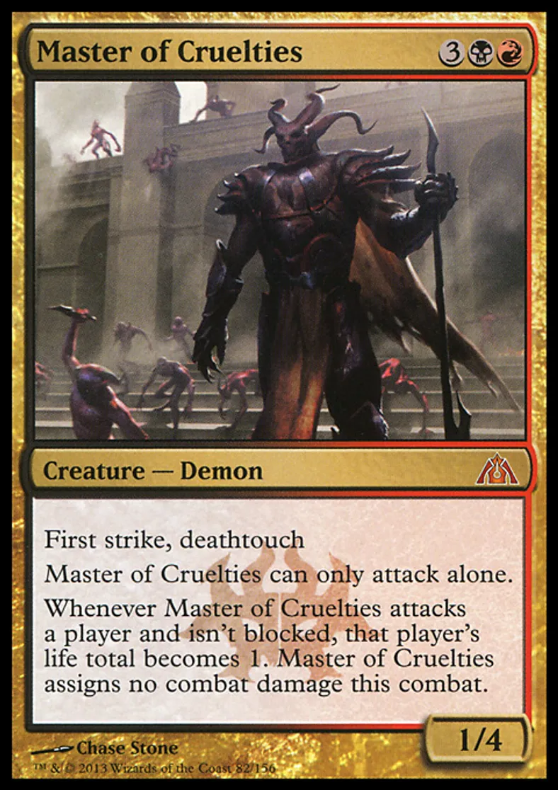 | Oracle Text | First strike, deathtouch Master of Cruelties can only attack alone. Whenever Master of Cruelties attacks a player and isn't blocked, that player's life total becomes 1. Master of Cruelties assigns no combat damage this combat. | ||