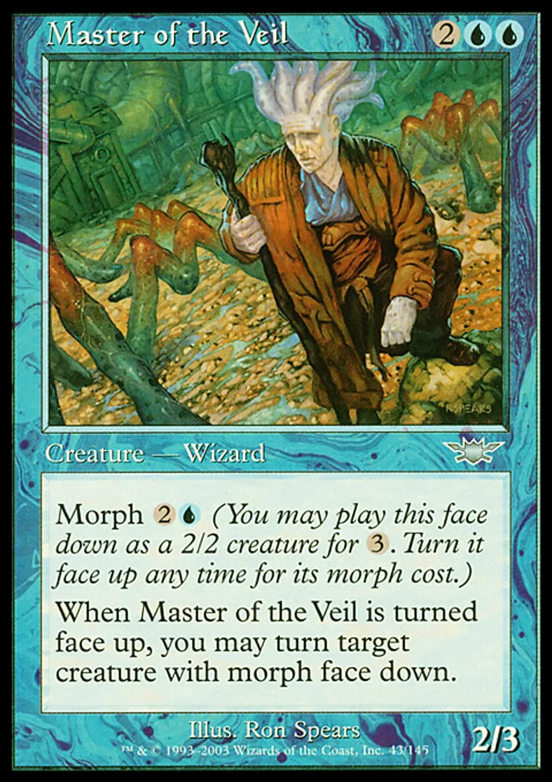 | Oracle Text | Morph {{2}}{{u}} (You may cast this face down as a 2/2 creature for {{3}}. Turn it face up any time for its morph cost.) When Master of the Veil is turned face up, you may turn target creature with morph face down. | ||