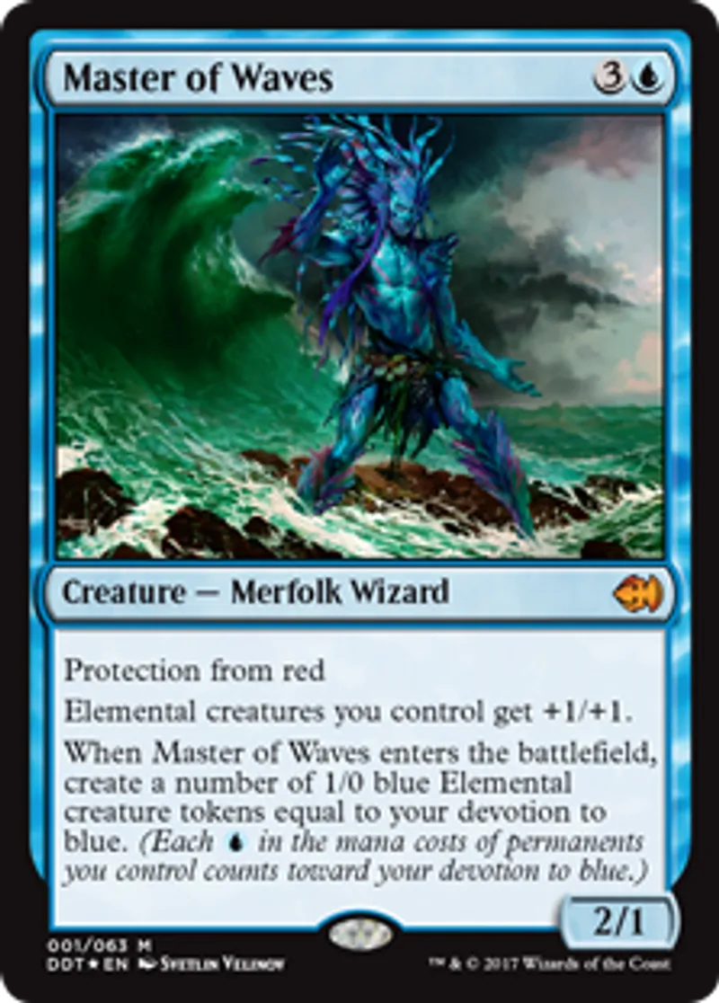 | Oracle Text | Protection from red Elemental creatures you control get +1/+1. When Master of Waves enters the battlefield, create a number of 1/0 blue Elemental creature tokens equal to your devotion to blue. (Each {{u}} in the mana costs of permanents you control counts toward your devotion to blue.) | ||