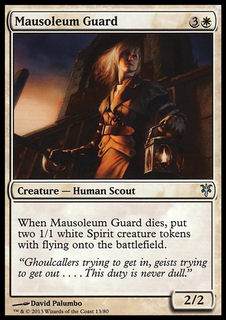 | Oracle Text | When Mausoleum Guard dies, put two 1/1 white Spirit creature tokens with flying onto the battlefield. | ||