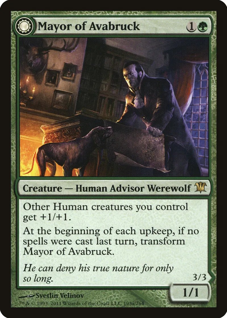 | Oracle Text | Other Human creatures you control get +1/+1. At the beginning of each upkeep, if no spells were cast last turn, transform Mayor of Avabruck. | ||