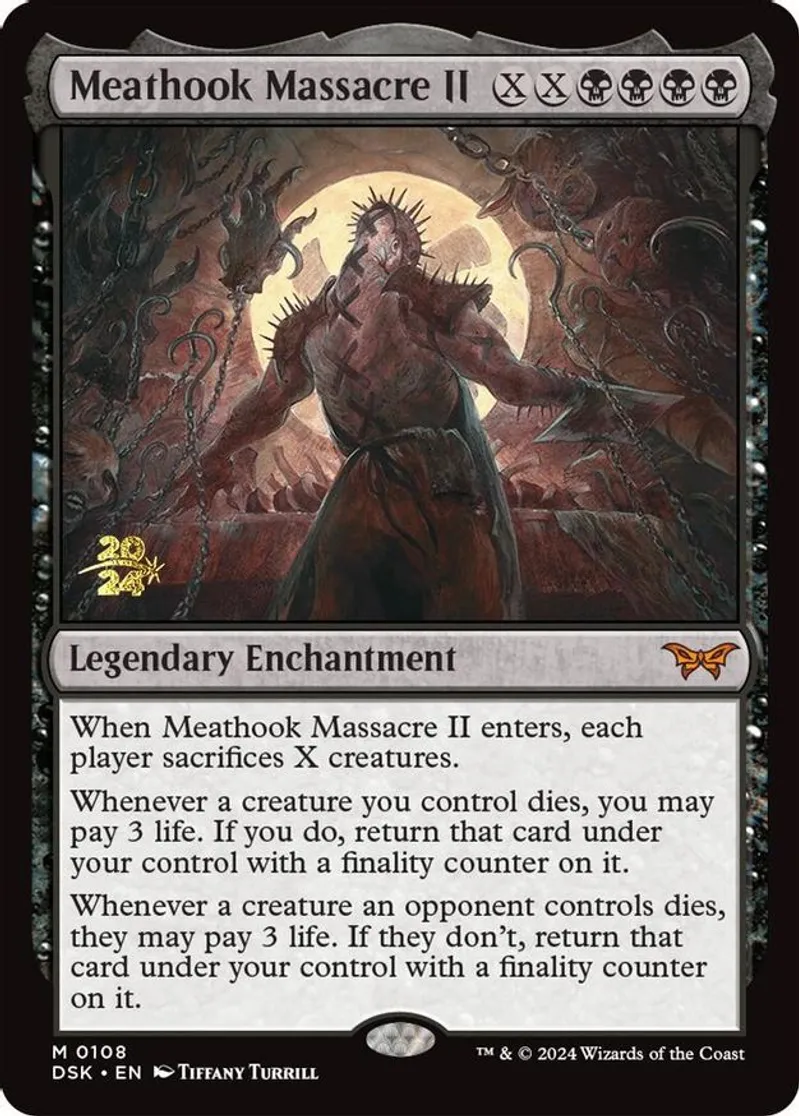Magic: the Gathering (mtg) Mythic Rare legendary enchantment Meathook Massacre II from Prerelease Cards (pPRE) last updated 2025-12-20 15:28:02