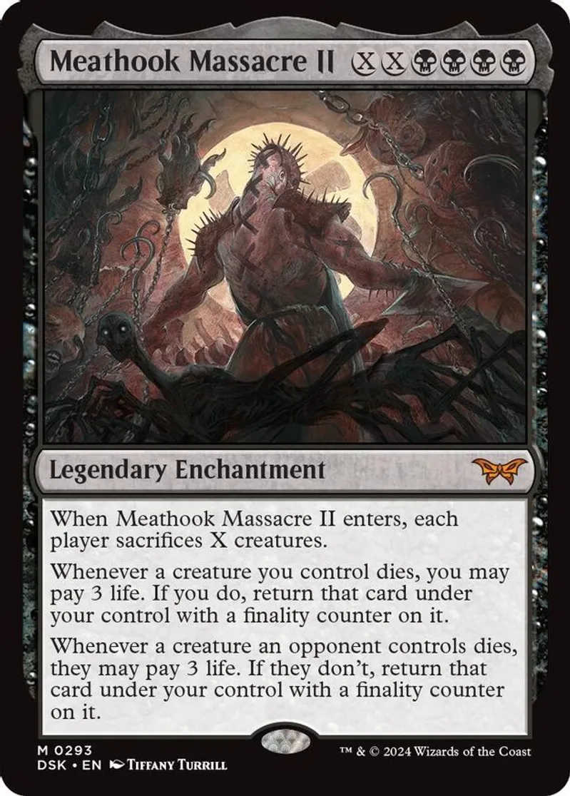 Magic: the Gathering (mtg) Mythic Rare legendary enchantment Meathook Massacre II from Duskmourn: House of Horror (DSK) last updated 2025-12-15 15:14:32
