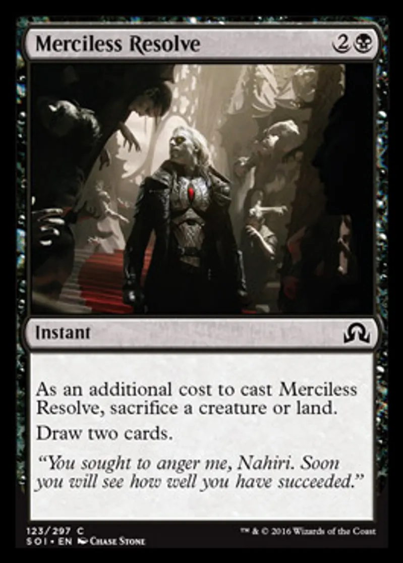 | Oracle Text | As an additional cost to cast Merciless Resolve, sacrifice a creature or land. Draw two cards. | ||