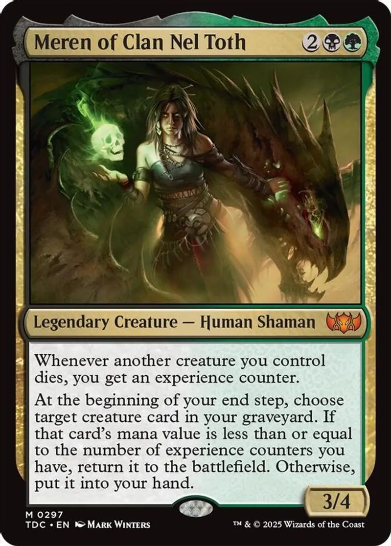 Magic: the Gathering (mtg) Mythic Rare legendary creature — human shaman Meren of Clan Nel Toth from Commander: Tarkir: Dragonstorm (TDC) last updated 2026-02-24 15:21:02