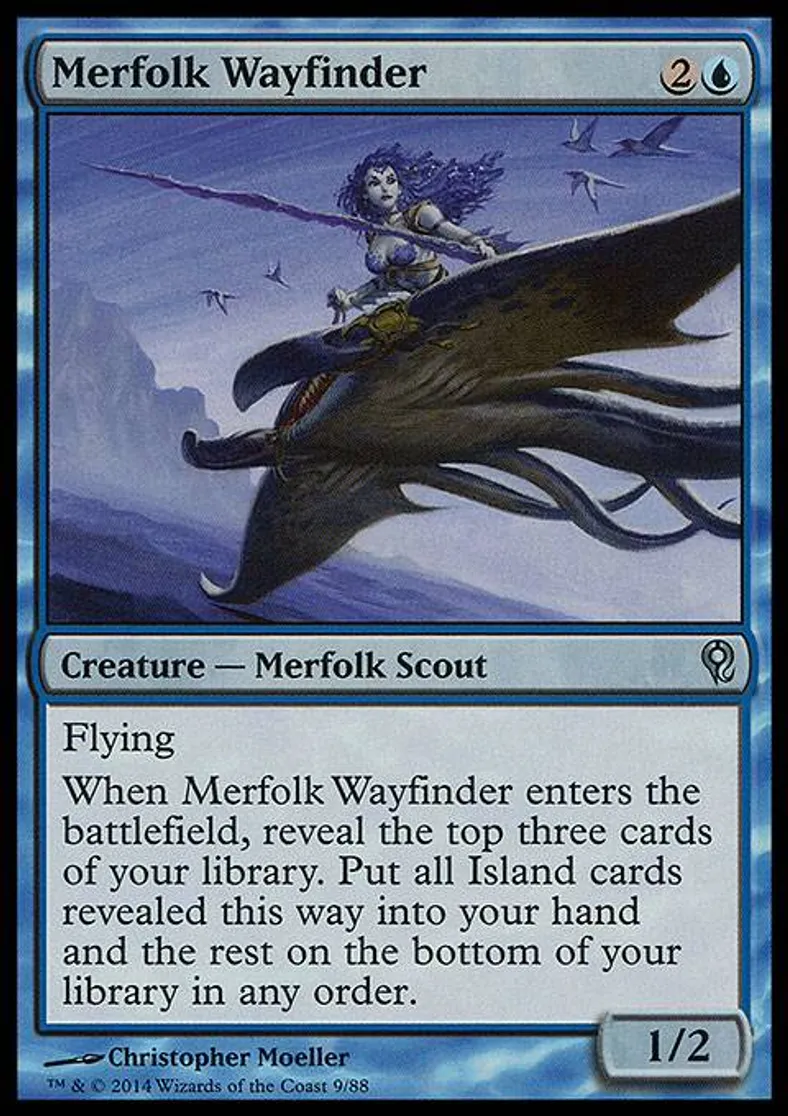 When Merfolk Wayfinder enters the battlefield, reveal the top three cards of your library. Put all Island cards revealed this way into your hand and the rest on the bottom of your library in any order. | ||
