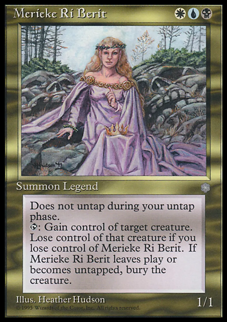 | Oracle Text | Merieke Ri Berit doesn't untap during your untap step. {{t}}: Gain control of target creature for as long as you control Merieke Ri Berit. When Merieke Ri Berit leaves the battlefield or becomes untapped, destroy that creature. It can't be regenerated. | ||