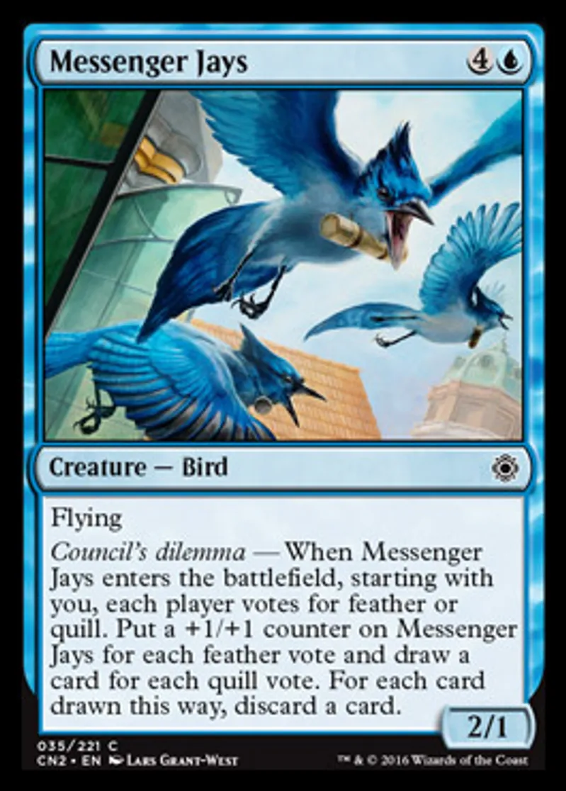 | Oracle Text | Flying Council's dilemma — When Messenger Jays enters the battlefield, starting with you, each player votes for feather or quill. Put a +1/+1 counter on Messenger Jays for each feather vote and draw a card for each quill vote. For each card drawn this way, discard a card. | ||