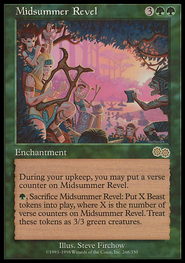 | Oracle Text | At the beginning of your upkeep, you may put a verse counter on Midsummer Revel. {{g}}, Sacrifice Midsummer Revel: Put X 3/3 green Beast creature tokens onto the battlefield, where X is the number of verse counters on Midsummer Revel. | ||