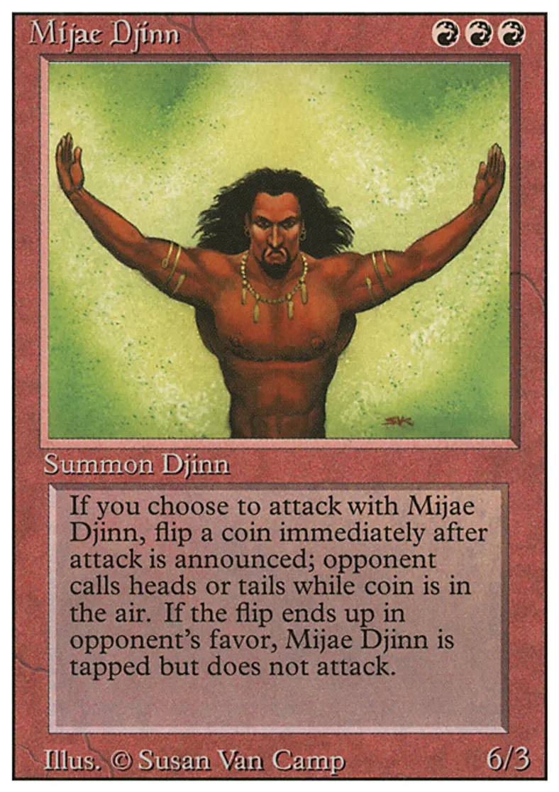 | Oracle Text | Whenever Mijae Djinn attacks, flip a coin. If you lose the flip, remove Mijae Djinn from combat and tap it. | ||
