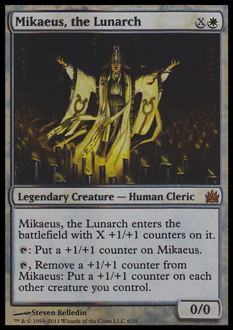 | Oracle Text | Mikaeus, the Lunarch enters the battlefield with X +1/+1 counters on it. {{t}}: Put a +1/+1 counter on Mikaeus. {{t}}, Remove a +1/+1 counter from Mikaeus: Put a +1/+1 counter on each other creature you control. | ||