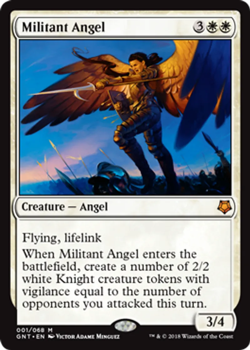 | Oracle Text | Flying, lifelink When Militant Angel enters the battlefield, create a number of 2/2 white Knight creature tokens with vigilance equal to the number of opponents you attacked this turn. | ||