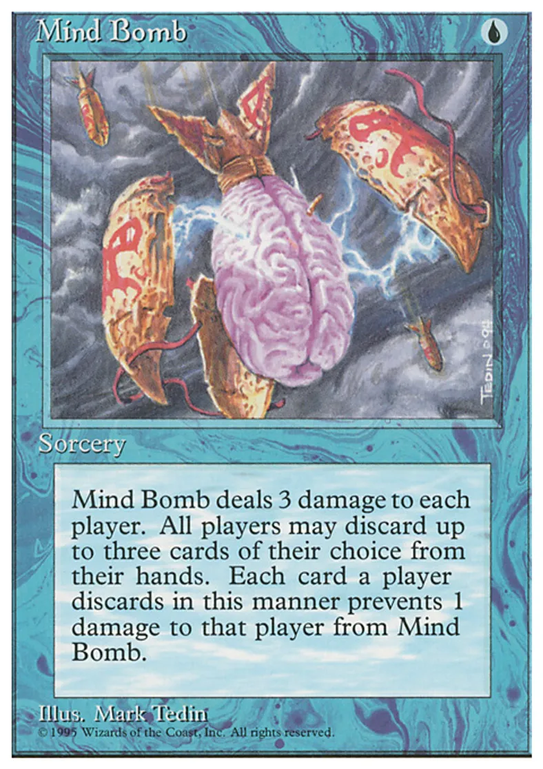 | Oracle Text | Each player may discard up to three cards. Mind Bomb deals damage to each player equal to 3 minus the number of cards he or she discarded this way. | ||