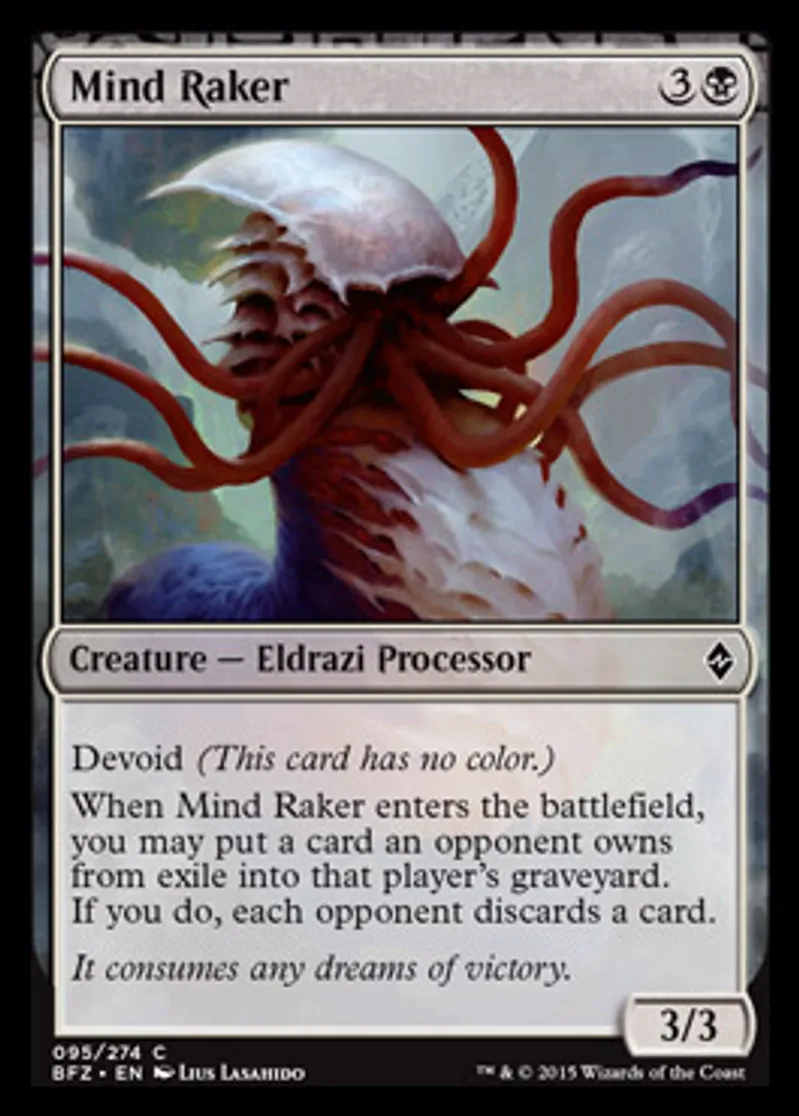 | Oracle Text | Devoid (This card has no color.) When Mind Raker enters the battlefield, you may put a card an opponent owns from exile into that player's graveyard. If you do, each opponent discards a card. | ||