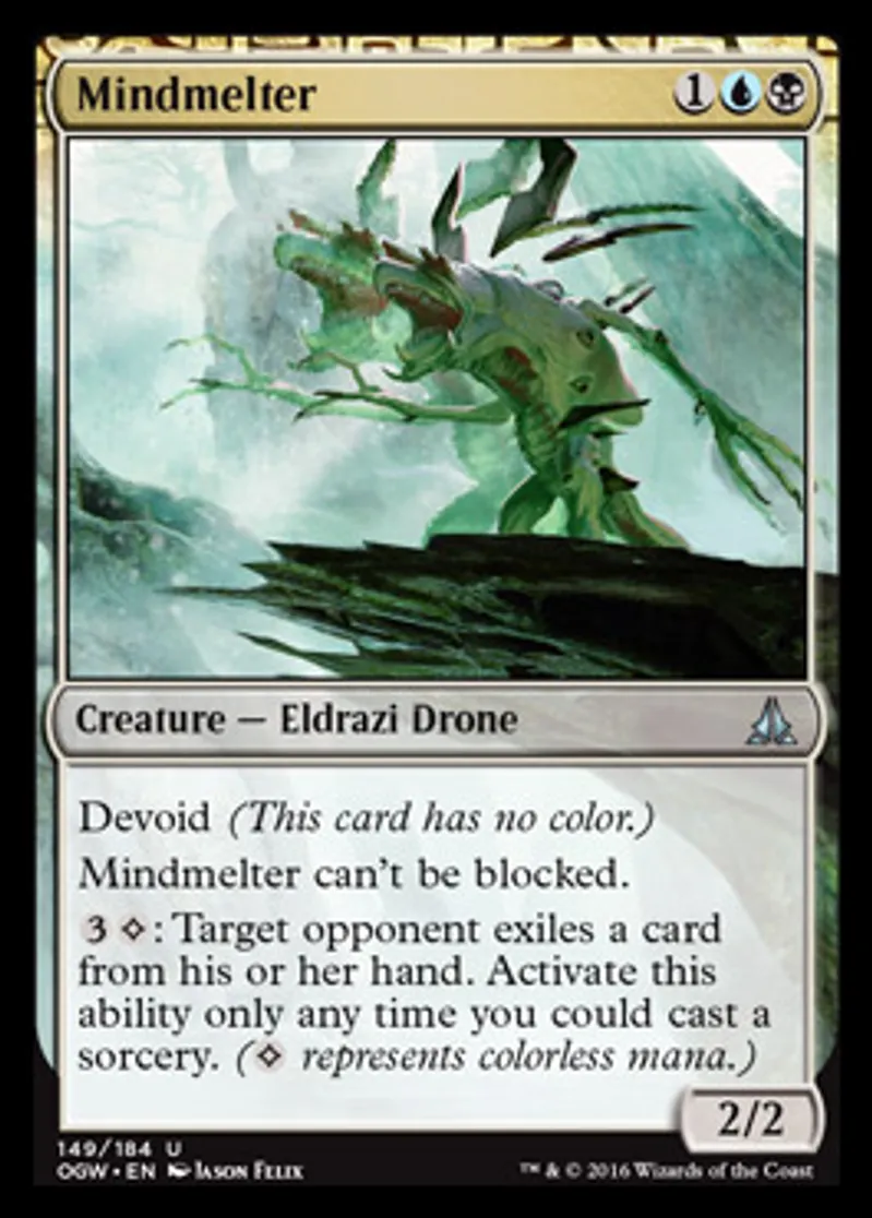 | Oracle Text | Devoid (This card has no color.) Mindmelter can't be blocked. {{3}}{{Colorless}}: Target opponent exiles a card from his or her hand. Activate this ability only any time you could cast a sorcery. ({{Colorless}} represents colorless mana.) | ||