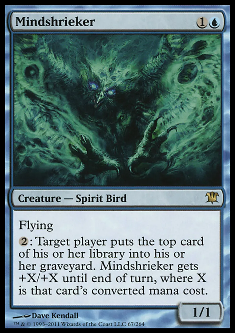 | Oracle Text | Flying {{2}}: Target player puts the top card of his or her library into his or her graveyard. Mindshrieker gets +X/+X until end of turn, where X is that card's converted mana cost. | ||