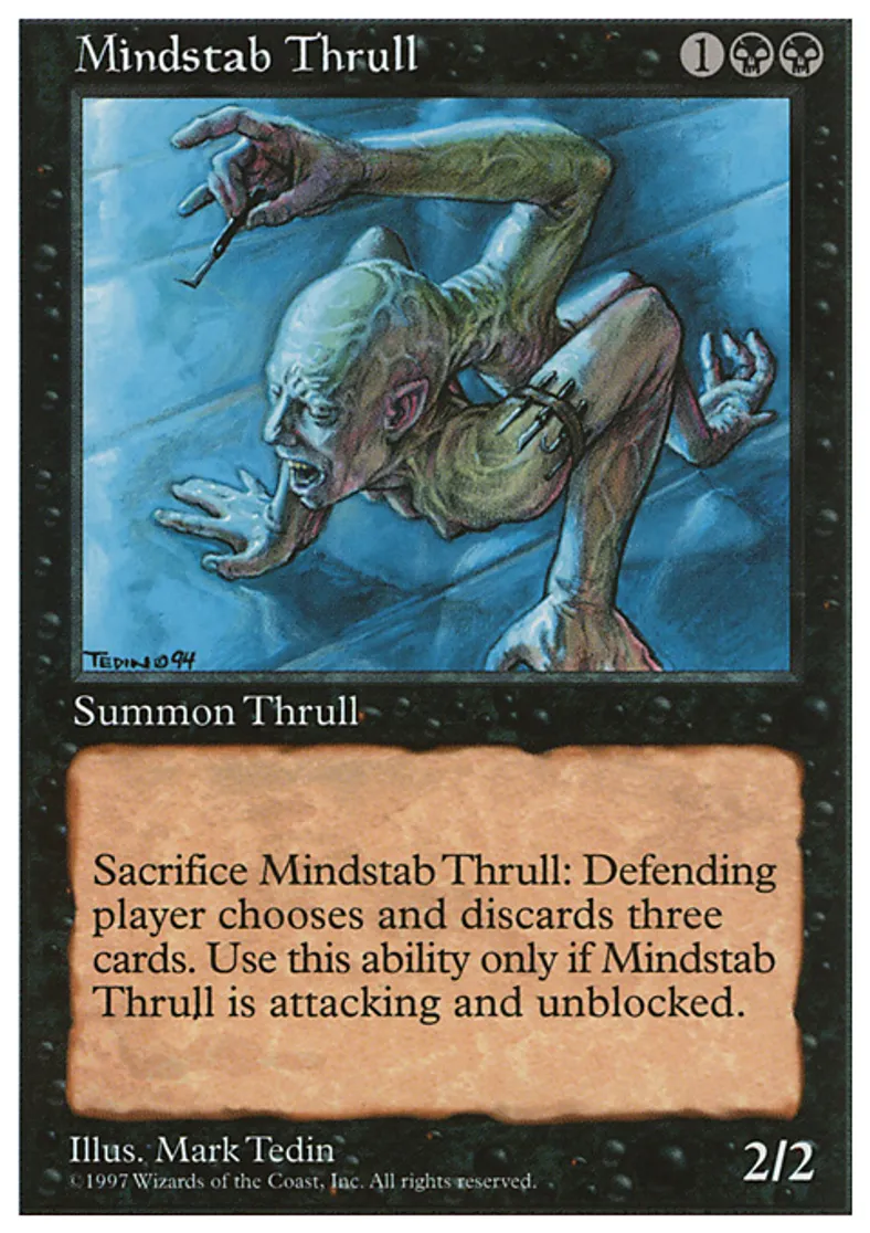 | Oracle Text | Whenever Mindstab Thrull attacks and isn't blocked, you may sacrifice it. If you do, defending player discards three cards. | ||