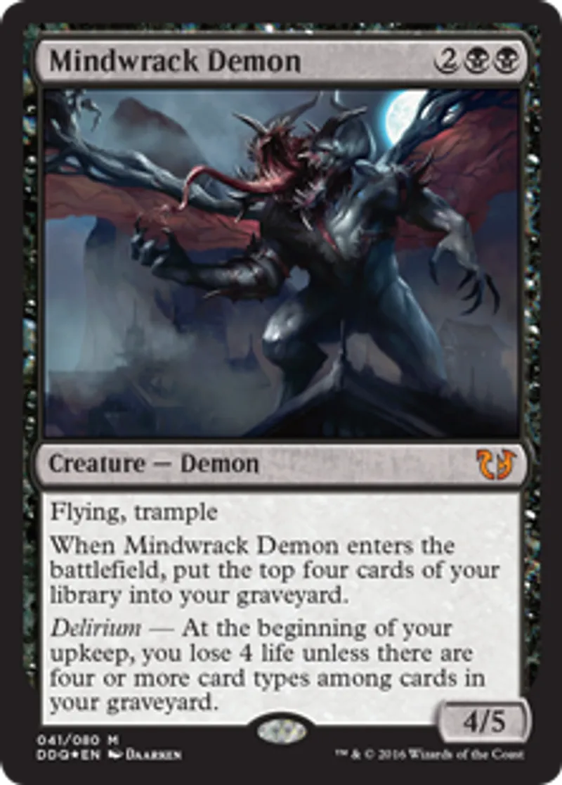 | Oracle Text | Flying, trample When Mindwrack Demon enters the battlefield, put the top four cards of your library into your graveyard. Delirium — At the beginning of your upkeep, you lose 4 life unless there are four or more card types among cards in your graveyard. | ||