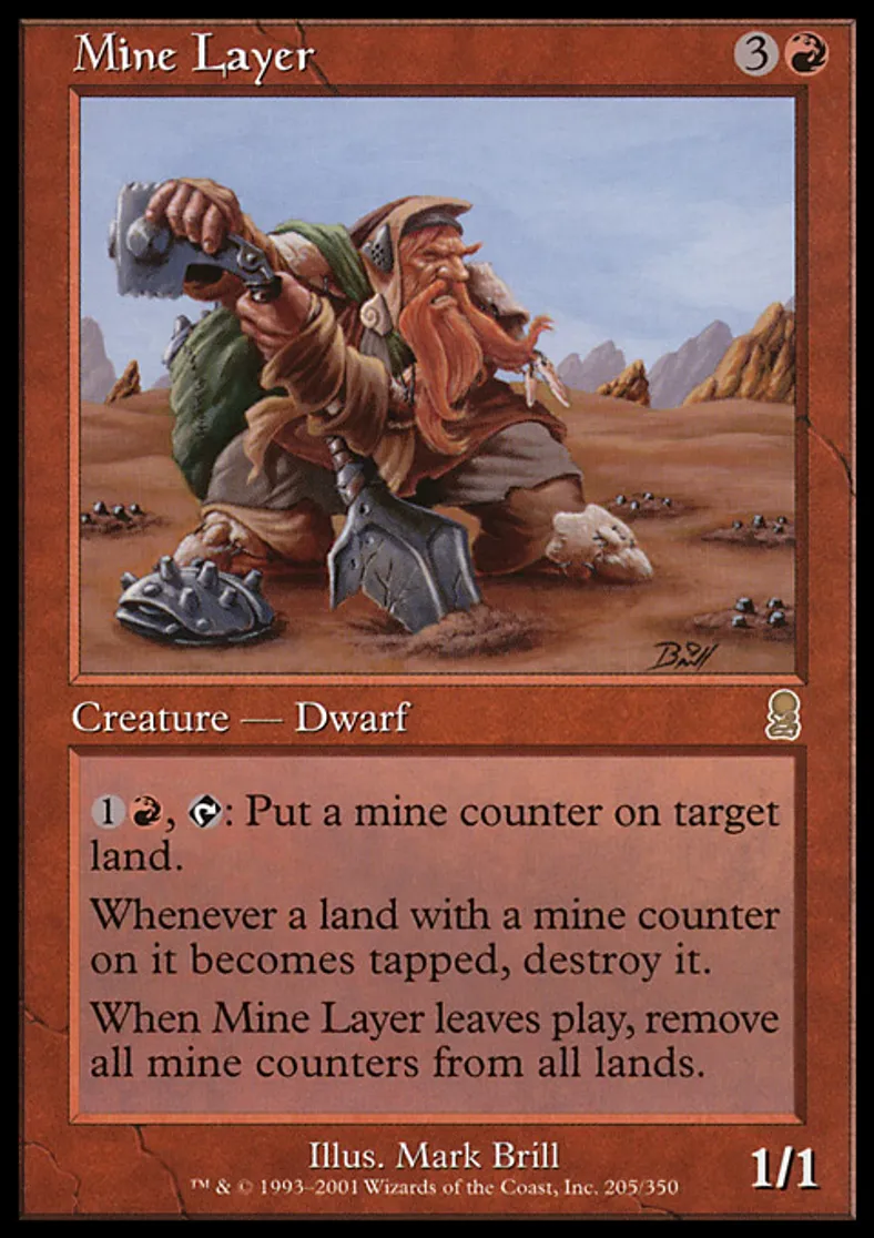 | Oracle Text | {{1}}{{r}}, {{t}}: Put a mine counter on target land. Whenever a land with a mine counter on it becomes tapped, destroy it. When Mine Layer leaves the battlefield, remove all mine counters from all lands. | ||
