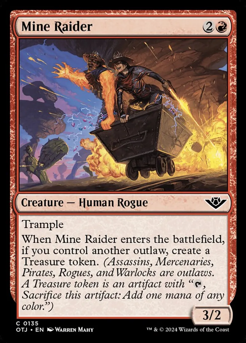 When Mine Raider enters the battlefield, if you control another outlaw, create a Treasure token. (Assassins, Mercenaries, Pirates, Rogues, and Warlocks are outlaws. A Treasure token is an artifact with "{T}, Sacrifice this artifact: Add one mana of any color.") | ||