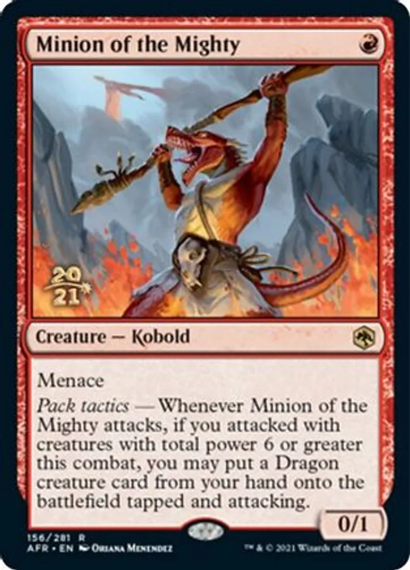 Pack tactics — Whenever Minion of the Mighty attacks, if you attacked with creatures with total power 6 or greater this combat, you may put a Dragon creature card from your hand onto the battlefield tapped and attacking. | ||