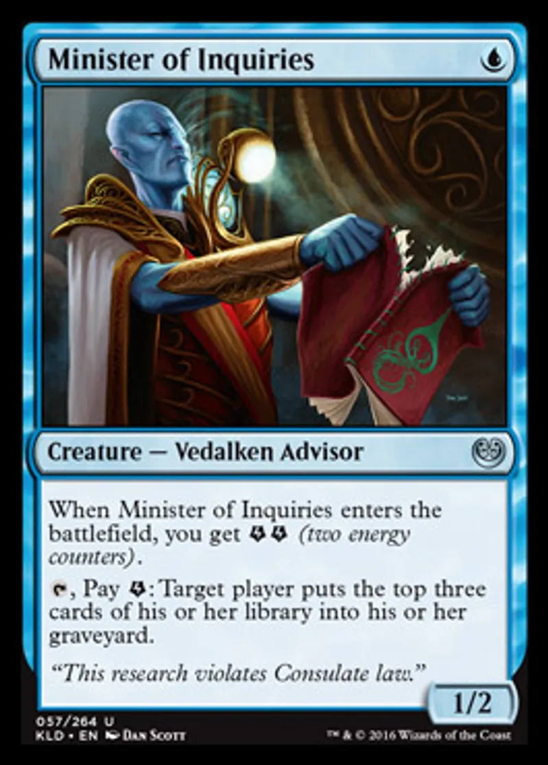 | Oracle Text | When Minister of Inquiries enters the battlefield, you get {{Energy}}{{Energy}} (two energy counters). {{t}}, Pay {{Energy}}: Target player puts the top three cards of his or her library into his or her graveyard. | ||