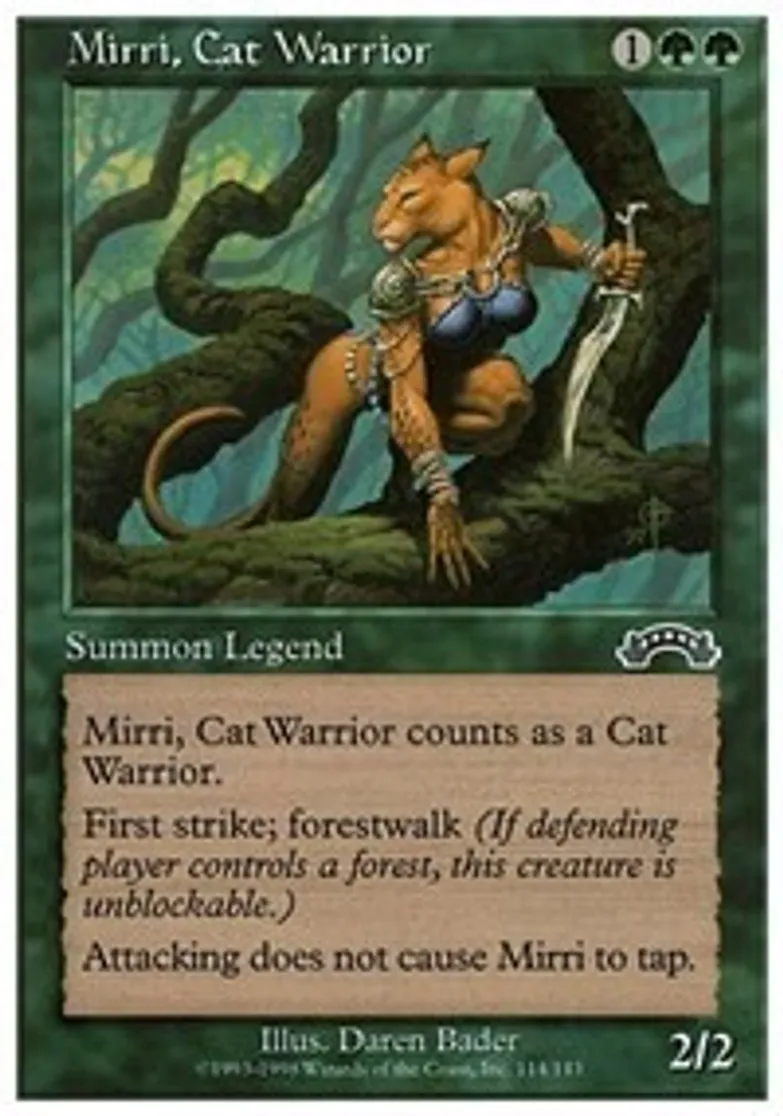 | Oracle Text | Mirri, Cat Warrior counts as a Cat Warrior. First strike, forestwalk (If defending player controls any forests, this creature is unblockable.) Attacking does not cause Mirri to tap. | ||