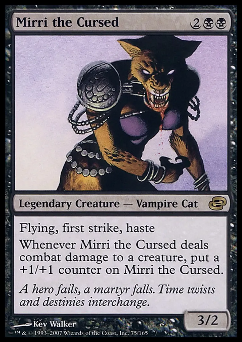 | Oracle Text | Flying, first strike, haste Whenever Mirri the Cursed deals combat damage to a creature, put a +1/+1 counter on Mirri the Cursed. | ||