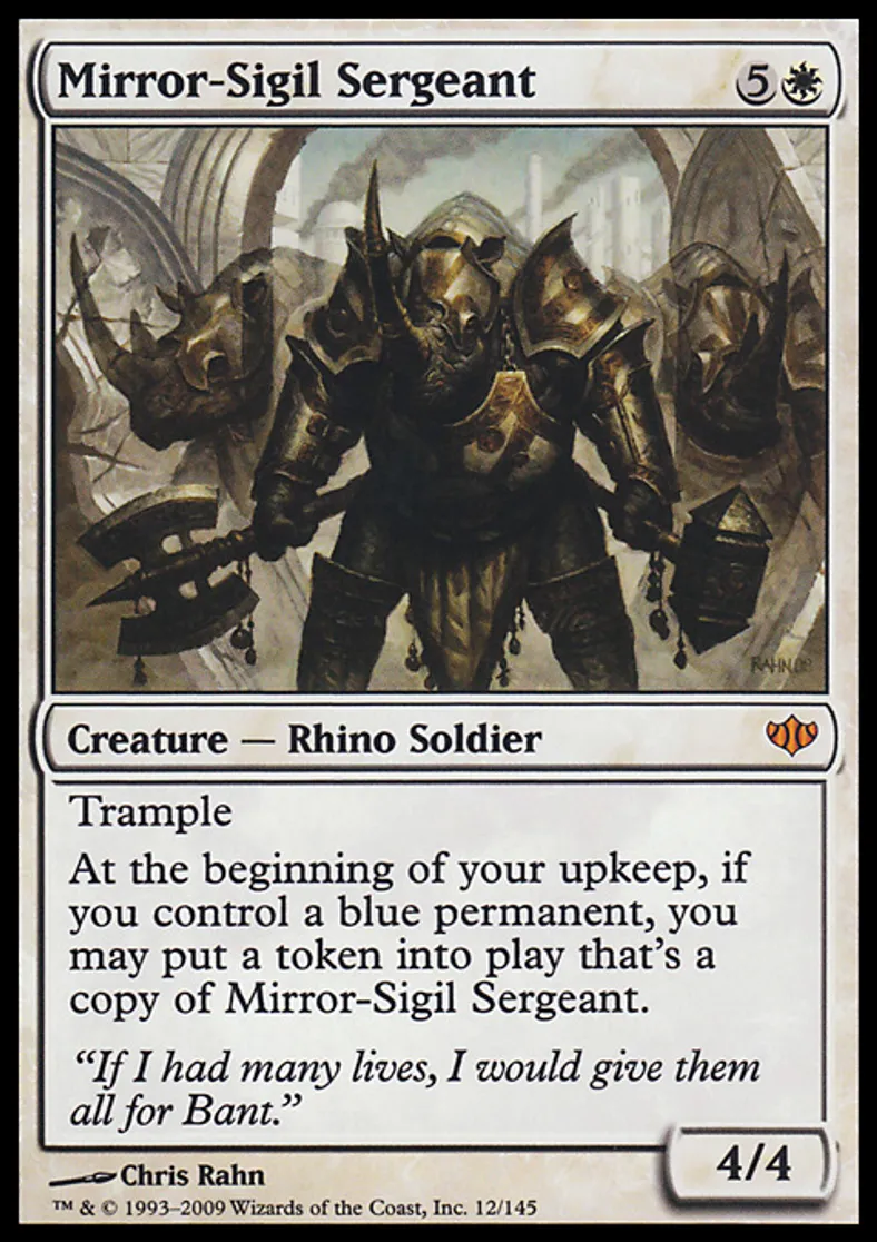 | Oracle Text | Trample At the beginning of your upkeep, if you control a blue permanent, you may put a token that's a copy of Mirror-Sigil Sergeant onto the battlefield. | ||
