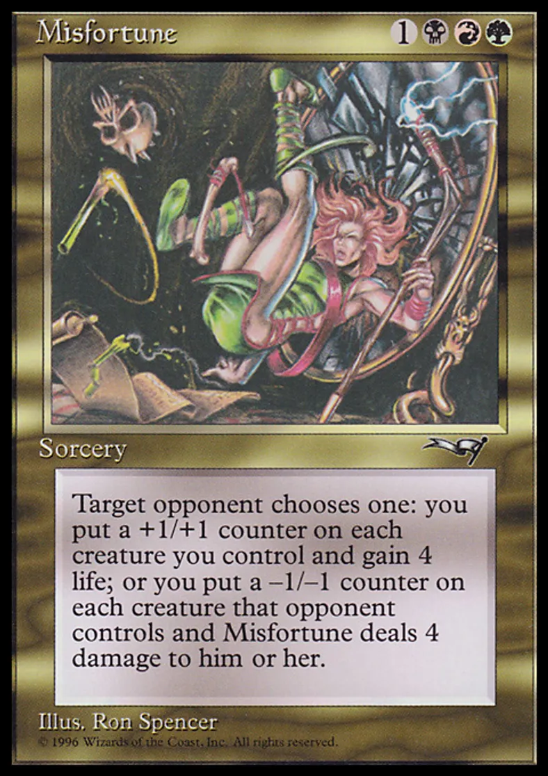 | Oracle Text | An opponent chooses one — You put a +1/+1 counter on each creature you control and gain 4 life; or you put a -1/-1 counter on each creature that player controls and Misfortune deals 4 damage to him or her. | ||