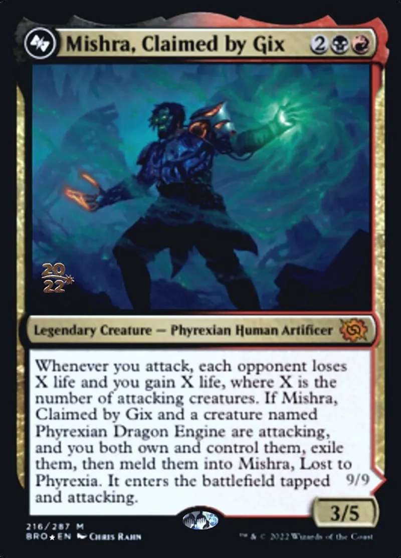 | Oracle Text | Whenever you attack, each opponent loses X life and you gain X life, where X is the number of attacking creatures. If Mishra, Claimed by Gix and a creature named Phyrexian Dragon Engine are attacking, and you both own and control them, exile them, then meld them into Mishra, Lost to Phyrexia. It enters the battlefield tapped and attacking. | ||